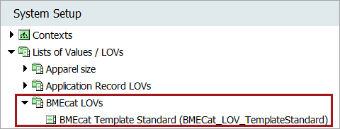In the System Setup tab, under the LOV node, a BMEcat LOVs folder displays, which was created when selecting the Industry Model Template Easy Setup action. Expanding the folder displays the BMEcat Template Standard List Of Values.