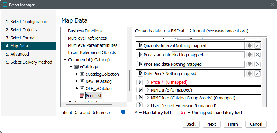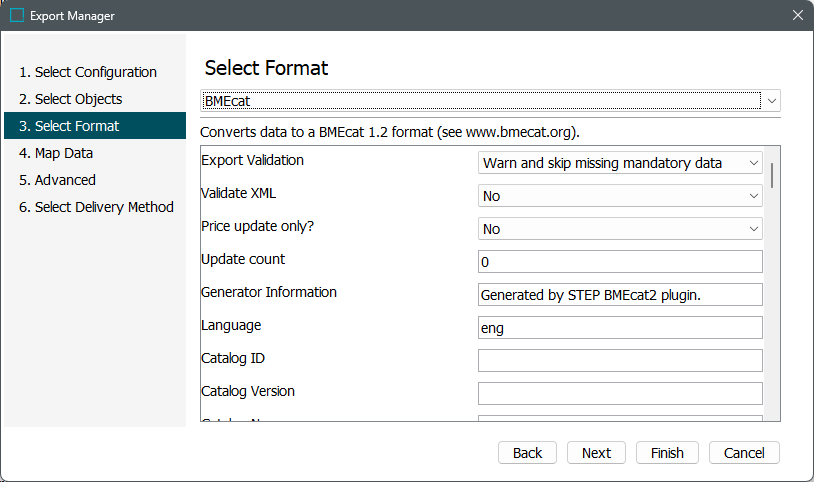 Exporting the BMEcat format involves supplying header data and catalog / product data via the parameters displayed on the Select Format step and during the Map Data step. Some information is required, as is indicated on the Map Data step. Although the export process can be run while mandatory fields are missing, the background process (BGP) will fail.