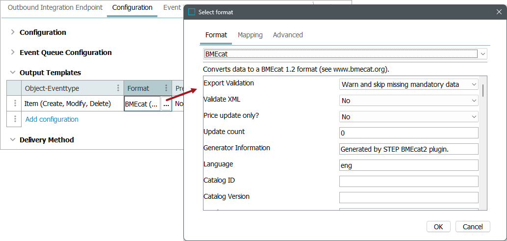 For more information on configuring eCatalogs for export via BMEcat, refer to the 'Configure an eCatalog Configuration for BMEcat' section of the Creating and Editing an eCatalog Configuration topic in the eCatalogs documentation.