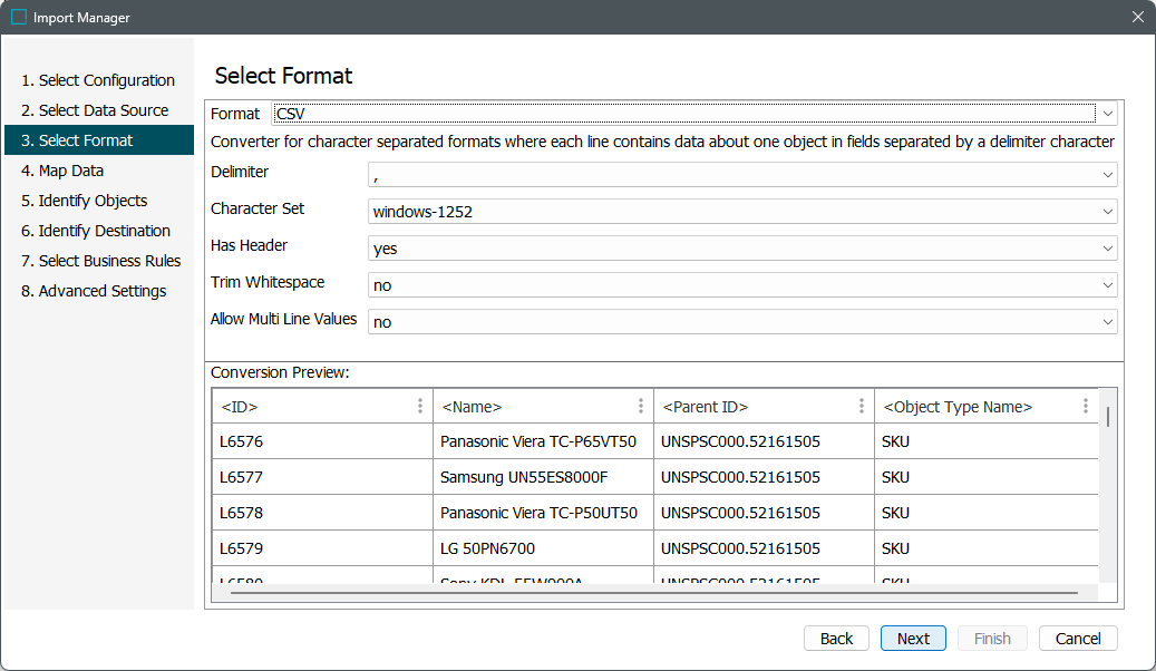 Important: Only the delimiters in the dropdown are allowed. If the file uses a different delimiter, before importing, first update the file outside of STEP to use a delimiter allowed by STEP.