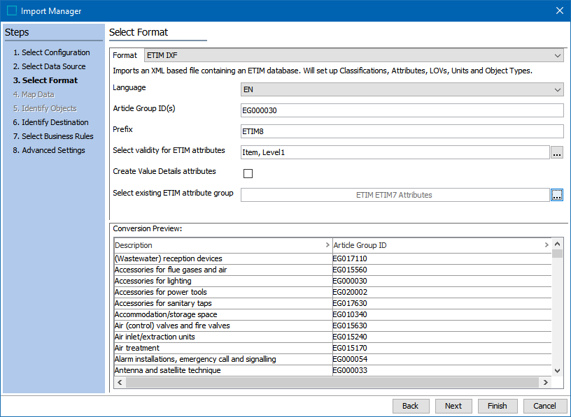 • Conversion Preview displays article groups that were read from the ETIM import file in the selected language.