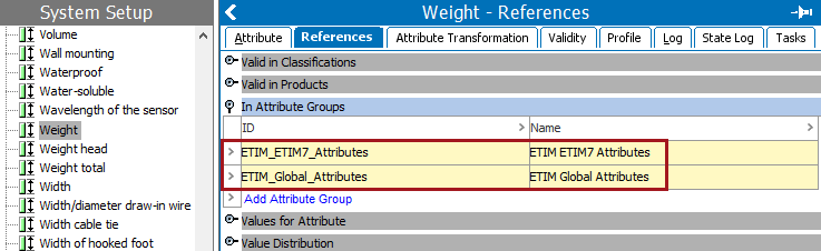 In the example below, the 'Weight' specification attribute is needed for both ETIM5 and ETIM7 data. The single attribute with the name 'Weight' is added to two attribute groups and is displayed on the References tab of the attribute under the 'In Attribute Groups' section.