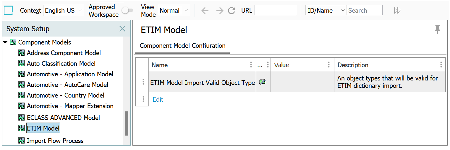 The functioning of the ETIM Taxonomy API Importer requires a data model for setting up the importer. A component model called ETIM Model must be configured to use the ETIM Taxonomy API Importer. When the easy setup actions are completed, many of the configurations for the ETIM Taxonomy API Importer are automatically configured within the ETIM Model that is available within the STEP workbench > System Setup > Component Models.
