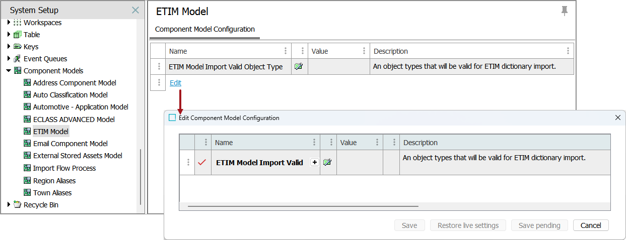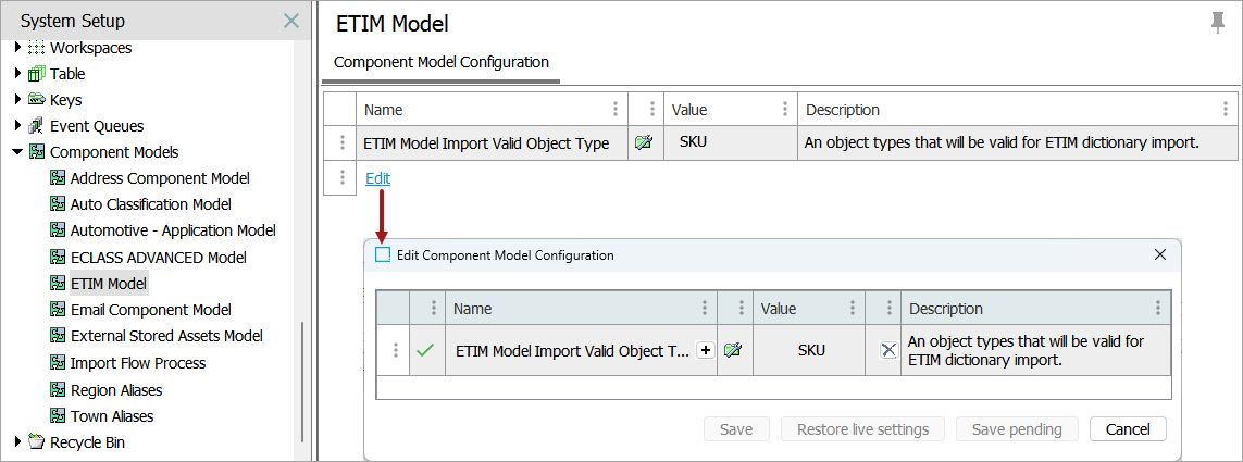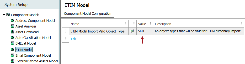 Note: Once an object type is assigned, removing it later from the Component Model Configuration does not affect the validity of existing ETIM attributes. That is, attributes already valid for the object type remain valid. However, future imports from ETIM will use the updated list of valid object types when updating ETIM attributes.
