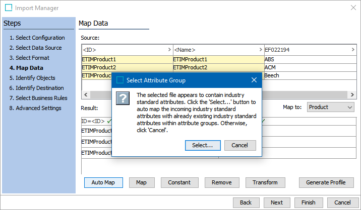 For example, if you have the same attribute in ETIM7 and ETIM8 attribute groups, the message in the image below displays. After clicking 'Select...,' you choose an attribute group that corresponds to the ETIM version you want to map to. And, then you continue with the import process as described in Import Manager - Map Data topic.