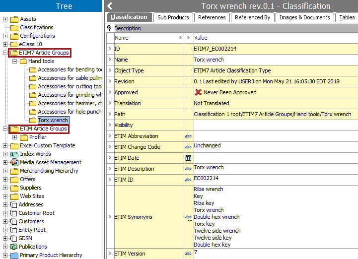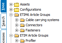 ETIM classifications are imported into STEP as an alternate classification, below the ETIM Article Groups node in the Tree.