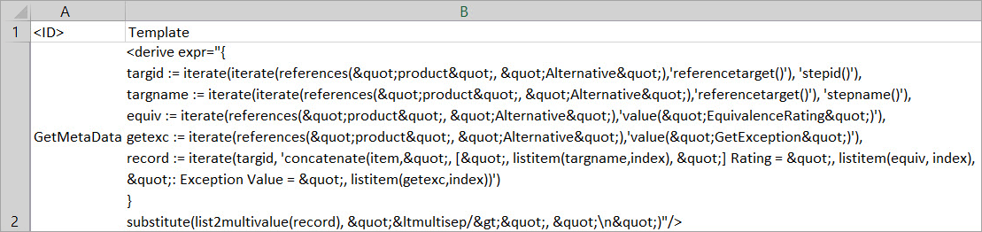 Important: If the pasted text includes an extra set of double quotes surrounding the entire value template, they must be removed for successful import. For example, with this pasted text, the first and last characters must be removed: "<derive expr="FirstRevisionCreateDate()"/>"