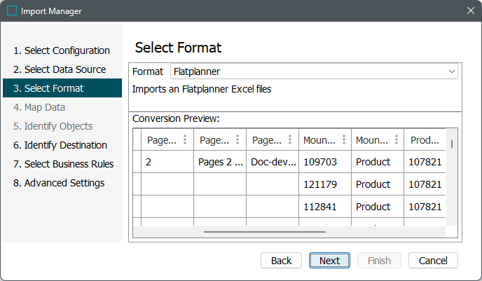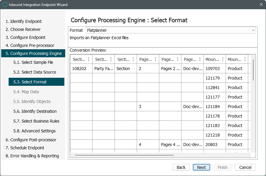 The Flatplan Excel format is displayed as 'Flatplanner' format for inbound data.