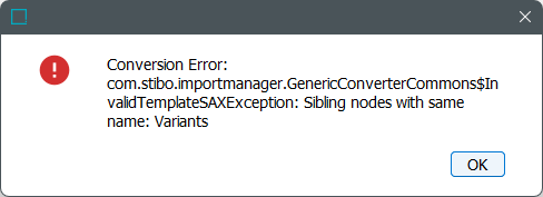 The source file includes redundant elements that should be removed to create a valid template. When duplicates exist, clicking the Sample reload button displays a message about sibling nodes with the same name: