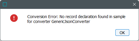 The source file includes actual data, but must include instructions to represent the data instead. To identify missing instructions, click the Sample reload button and a message is displayed about a missing record declaration: