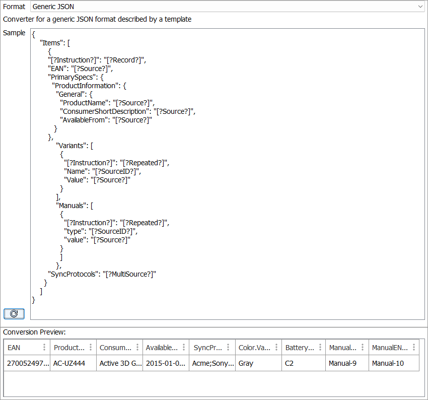Click the Sample reload button . The Conversion Preview area displays the results of the input document against the provided template.