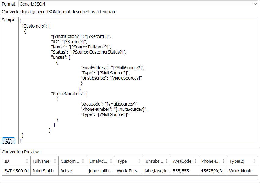• In the "Emails" and "PhoneNumbers" arrays, the "[?MultiSource?]" instruction is added in place of the values for each of the attributes within the respective objects.