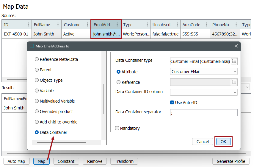 On the 'Map Email Address to' dialog, select the relevant attribute, check the 'Use Auto-ID' checkbox, and change the Data Container separator from the default of '#' to ';'. Click OK and the values are recognized as multiple rows in the data container. The same process is used for the next two columns, with relevant attributes selected.