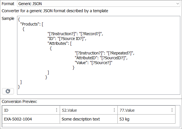 • "[?SourceID?]" is used to extract the identifier for a repeated element when the identifier is a value in a JSON object.