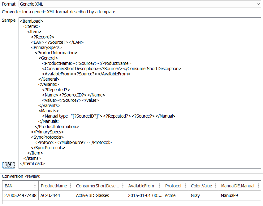 Click the Sample reload button . The Conversion Preview area displays the results of the input document against the provided template.