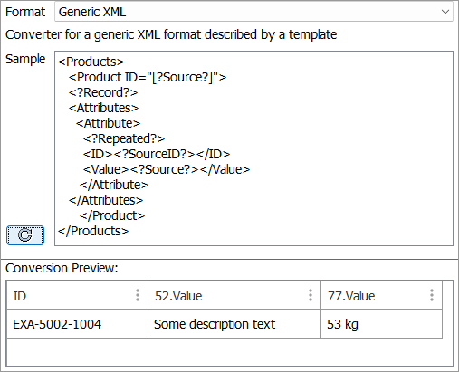 3. Enter or paste the template below in the Import Manager, and generate a conversion preview by clicking the refresh button, .