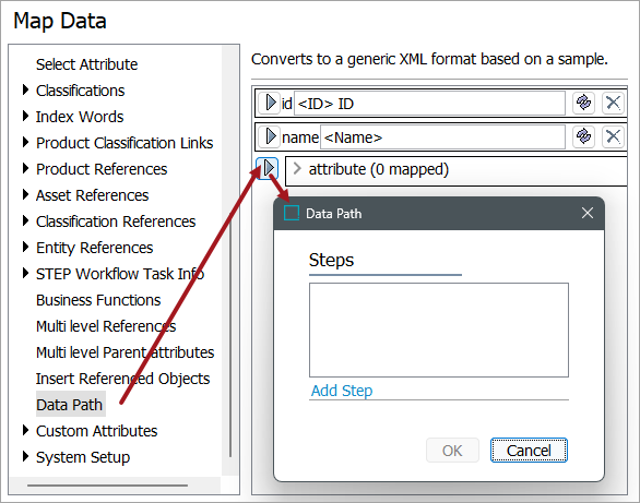 The Attribute Links and LOVs Processing Instructions in Generic XML topic discusses additional setup for a Generic XML or IDoc MATMAS 05 export. Use the following steps to map the Product, linked attributes, and their LOV information.