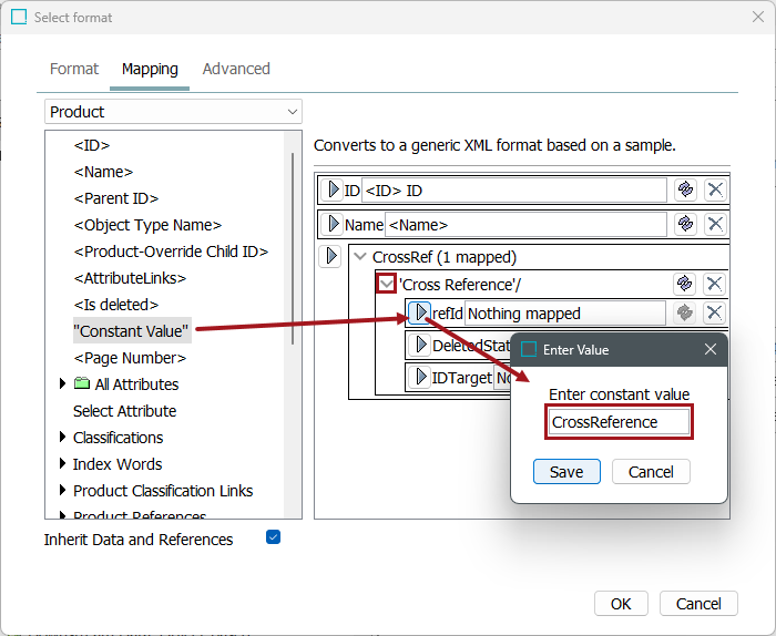 - Open the 'CrossReference'/ section, map Constant Value to refID, add the text, and click the Save button.