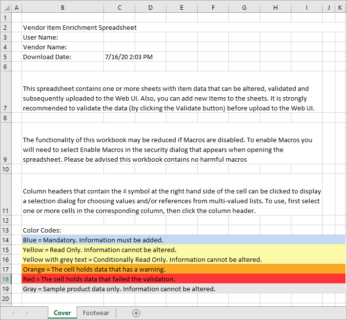 - Yellow = Read Only. Information will be ignored upon import and validation.
