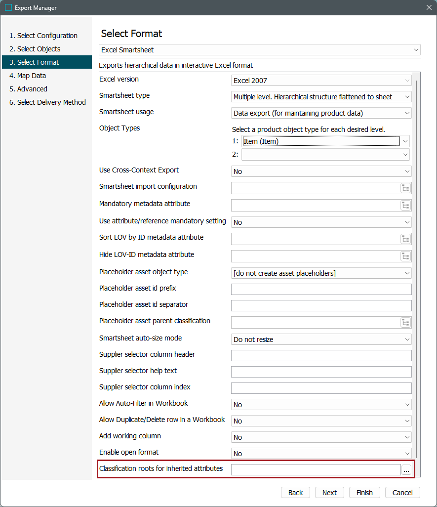The parameter 'Classification roots for inherited attributes' found on the 'Select Format' step of the Export Manager wizard, allows system administrators to configure one or more Product Classification Links Types when configuring a Smartsheet. When setting up a Smartsheet export, it is essential to ensure that the attributes linked to the classification are valid for exported object types. In case if the attributes with valid object types are not linked, the attributes will not export in the Smartsheet.