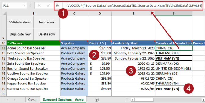 - Cells that contain formulas are always validated, since their values can change along with the source data. Changing a value in an external cell in source data is treated as a change in the sheet.