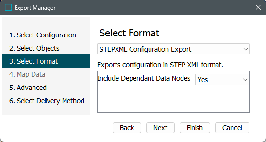The STEPXML Configuration Export format plugin is a utility feature for easily creating a cross-context STEPXML file that contains the full STEP configuration (minus user objects) and the data nodes that are required for being able to import the configuration on to an empty STEP system.