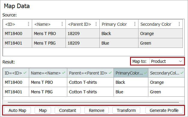 Once mapped, source columns are shown with an yellow background. The result section displays a green check for a data column that has been validated for the object type.