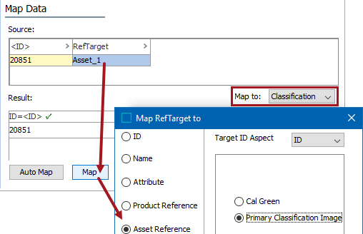 • Only classification-to-asset references are displayed after selecting the Asset Reference radio button on the Map ... to dialog. The Result section shows the selected classification-to-asset reference type.