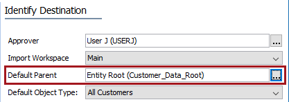 • On the Identify Destination step of the import, on the Default Parent parameter, click the ellipsis button () to display the valid entity parent nodes. Select a node and click the Select button.