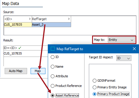 • Only entity-to-asset references are displayed after selecting the Asset Reference radio button on the Map ... to dialog. The Result section shows the selected entity-to-asset reference type.