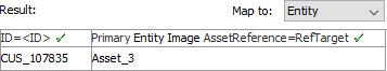 1. Click OK and the Result panel displays your asset reference values. The Result section shows the selected product-to-asset reference type. A validated data column is marked with a green check mark as shown below.