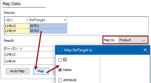 3. In the Source section, select the reference target column and then click the Map button to display the Map ... to dialog. The label of the field is used within the title of this dialog.