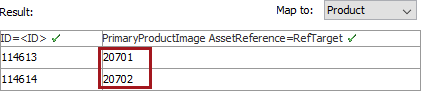 This example shows an Excel import file (although any inbound format can be used). The file includes target asset objects to be used as the primary product image for two products (indicated by the ID column).