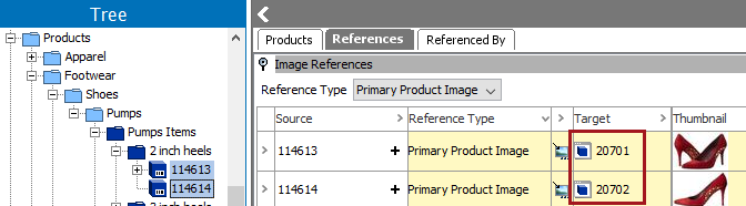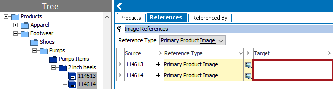 The import will specify an asset that should reference a product using the reference type 'Primary Product Image.' Before the import, there are no image references for either source product, as shown simultaneously in the image below.