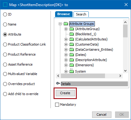 1. In the 'Map to' window, select the attribute radio button and navigate to the appropriate attribute group to house the new attribute. Click the Create button.
