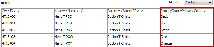 1. Click OK and the Result panel displays your selection of column and attribute. A validated data column is marked with a green check mark as shown below.