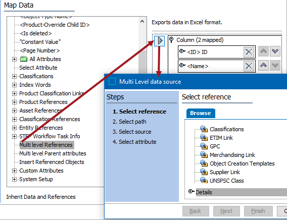 The multi-level references data source option allows you to map data from referenced or ancestor objects. You can also map so that one or more additional rows are generated for referenced objects. This option is available and mapped the same for product, classification, asset, and entity objects.