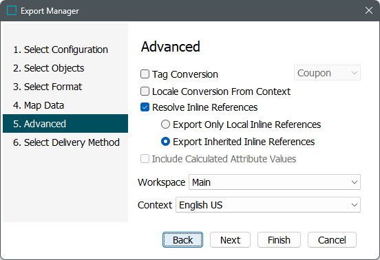 Resolve Inline References: Determines how inline references are resolved when exported. By default, this option is checked, which means that if inline references are included in the data, they will be resolved (rather than tagged) in the export. If not checked, inline references are exported with the inline references tagging. Once checked, choose one of the following options: