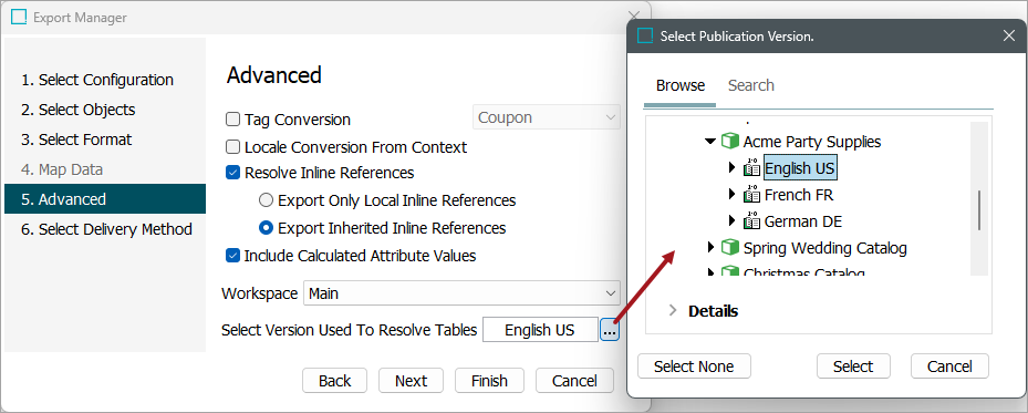 Select version used to resolve tables: This setting is available for STEPXML if 'Include Tables' is set to Yes and for Advanced STEPXML if the template includes version-dependent content. A publication version should be selected if the tables contain content relevant to a particular publication (such as column or row types that are only valid for certain publication types) or a publication version (such as commercial data). For more information, refer to the Exporting Resolved Tables topic in the Tables documentation.