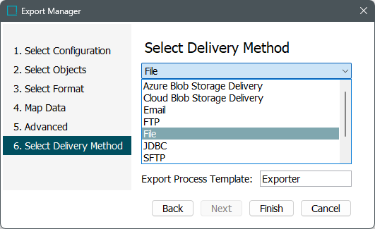 In the dropdown displaying the default 'File' option, select a delivery method. The available options are defined in the Delivery Methods section below.