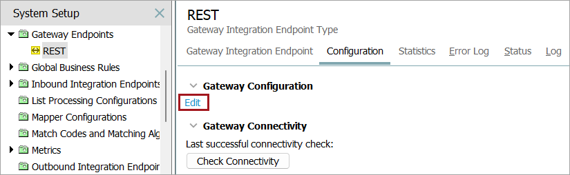 - On the Configuration tab, click the Edit link to display the Gateway Integration Endpoint Configuration dialog.