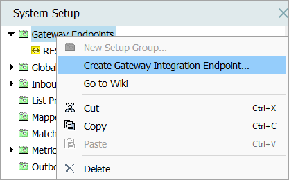 1. In System Setup, right-click the Gateway Endpoints setup group, and click Create Gateway Integration Endpoint.