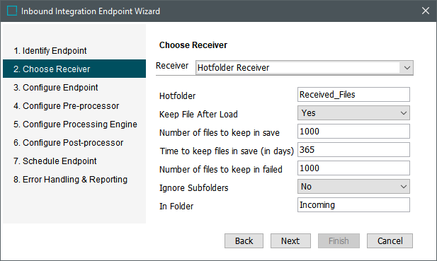 This default hotfolder option enables the setup of a monitored directory as the receiver. Files are placed into this folder and are processed by the integration endpoint. Typically this is on the application server or can be reached from the application server. When the endpoint polls the hotfolder and finds more than one file, the files are handled in sequence starting with the oldest file first, based on the last modified data stamp. All formats supported by the standard import functionality are available via hotfolder import.