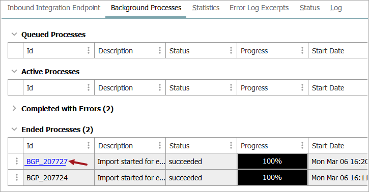 This tab holds information about any related processes. Hover over an ID to display the background process (BGP) link, click it to open the individual inbound background processes.