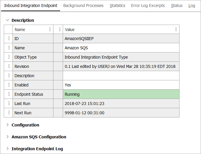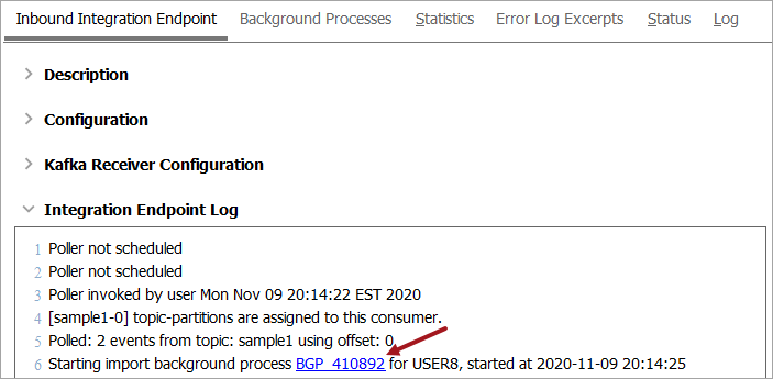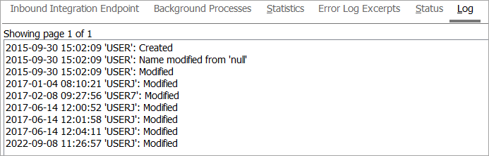 The Integration Endpoint Log section contains information about the endpoint background process. An entry is generated each time the endpoint is invoked, when background processes generated by the endpoint are started, and when processing errors occur.