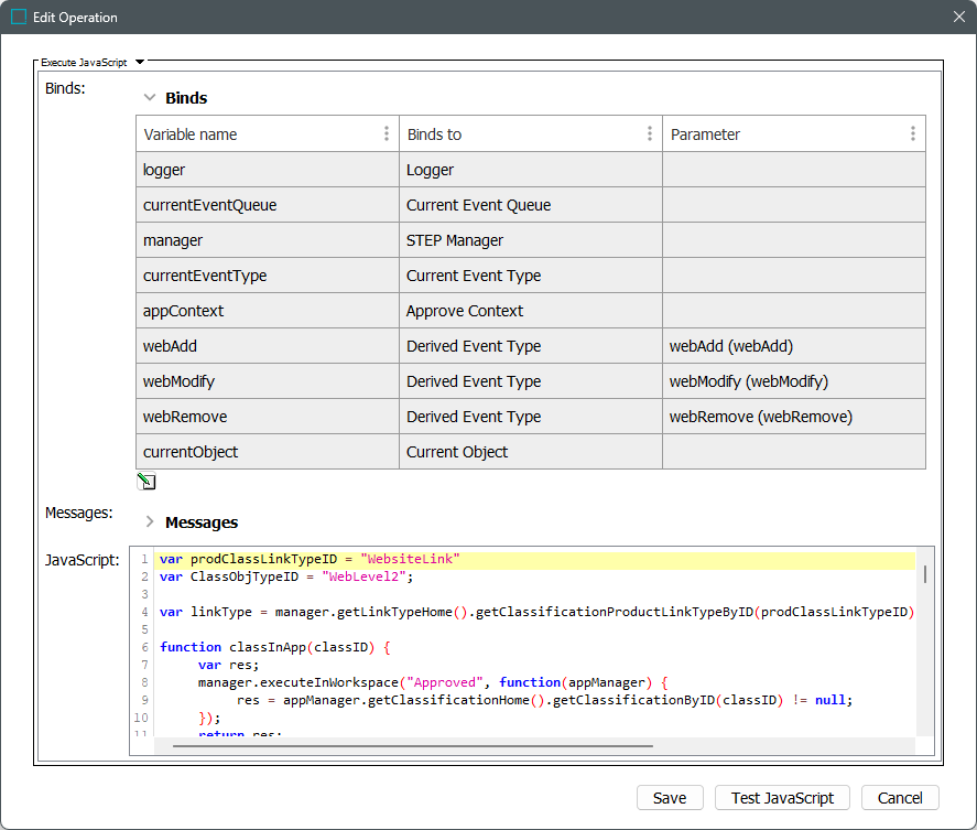 - If none of the above, the Approve Context is used to figure out whether the addition or removal of a WebsiteLink is currently being approved (is a part object). The link type is not accessible directly from a ClassificationLinkPartObject and thus, the target classification object type is used to figure out if the link type is correct. Also, because there is a risk that the target classification does not exist in the Approved workspace and the link would not be synchronized even though it is in the part object set, it is checked that the classification exists there.