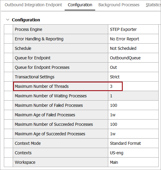 The default thread setting is one (1), in which case the endpoint produces a single message at a time, with all events in the batch processed serially. Increasing the thread number results in each batch size being divided by the thread number so that the contents of a batch can be processed in parallel.