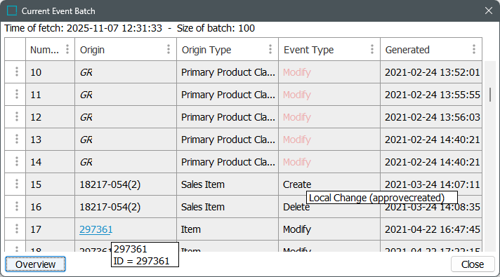 The Current Event Batch dialog displays the first 100 unread events on the queue.