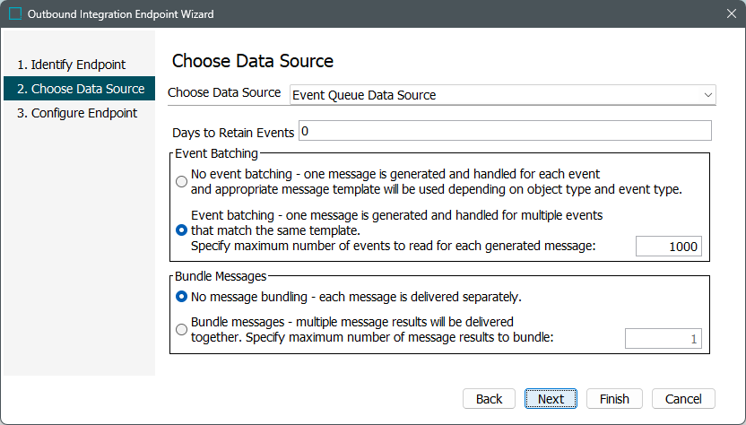 - Choose the data source Event Queue Data Source for incremental exports where data should be published based on events. Creating an event-based OIEP automatically creates an event queue to process events.