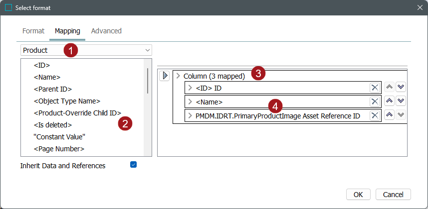 • In the Object Selection Configuration flipper, if a classification object is selected, and in the Output Templates section, the Format field has Asset selected in the Mapping tab (and relevant data sources are mapped), all assets below that classification object are exported.